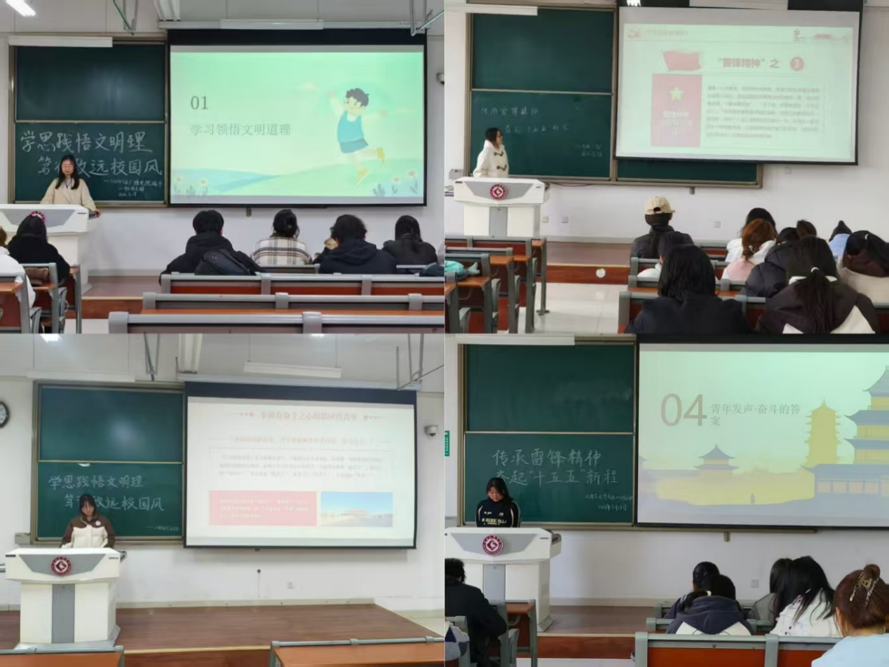 活动期间,各班团支部聚焦雷锋精神与时代使命以及“十五五”规划纲要等相关内容,将文明理论学习与校园文化建设紧密结合,通过专题学习、事迹分享、观看纪录片等形式,带领同学们深入学习雷锋同志的崇高品格与奉献精神,系统研读“十五五”规划核心要义,倡导文明言行、优良学风与和谐校园,引导大家将志愿服务、勤学笃行、个人理想融入国家发展大局,在专业学习上精益求精,在社会实践中甘于奉献,让文明理念内化于心、外化于行。