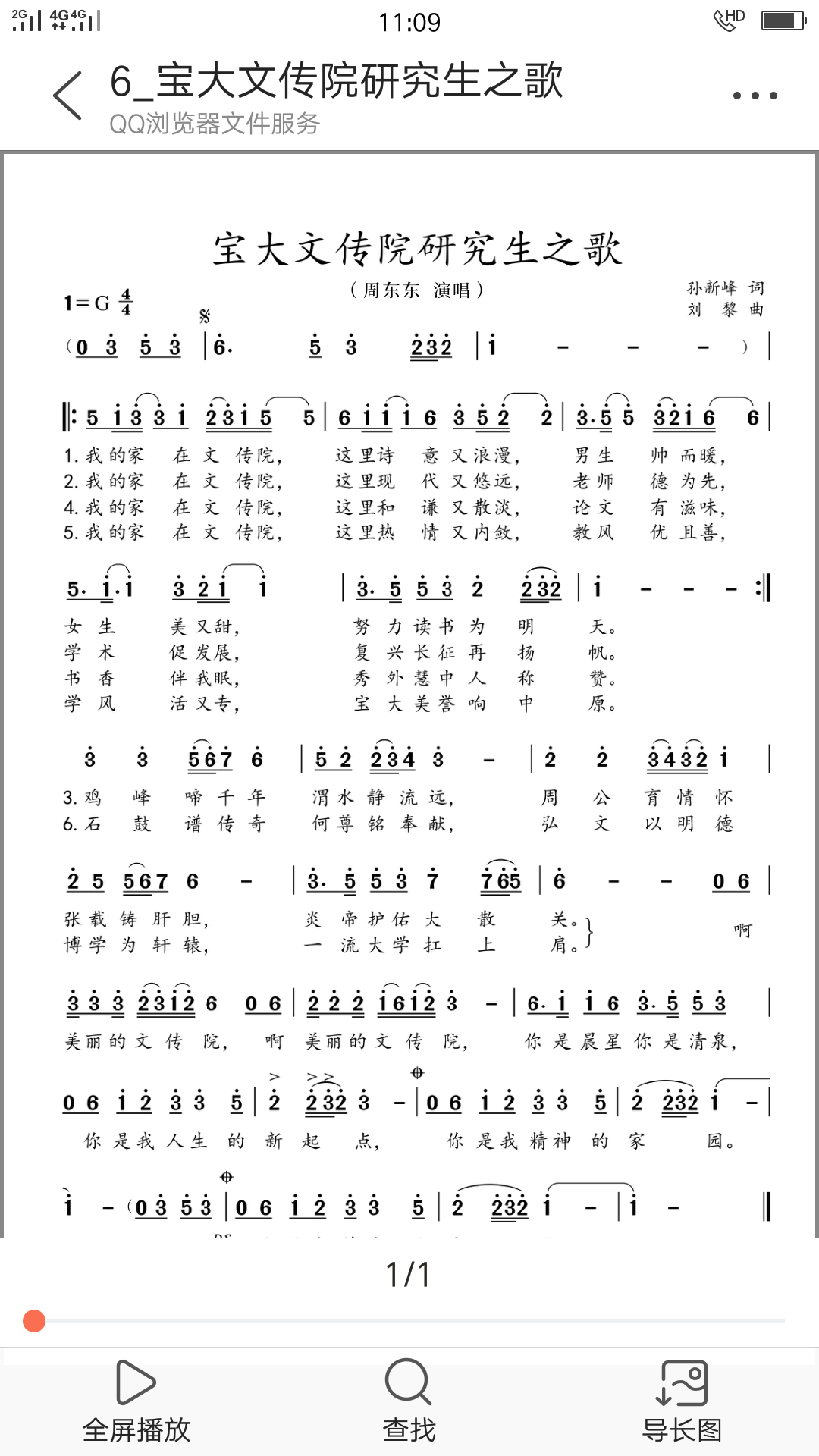 附:《宝大文传院研究生之歌》歌词、曲谱、演唱版本之一。