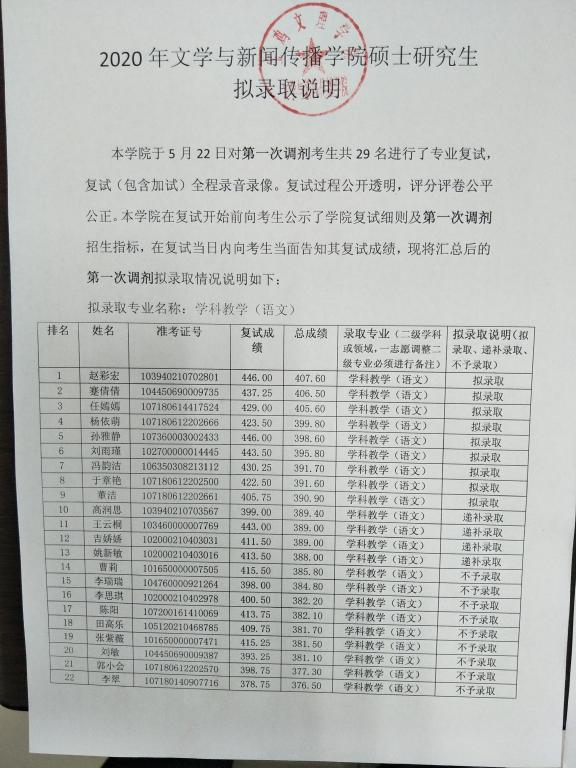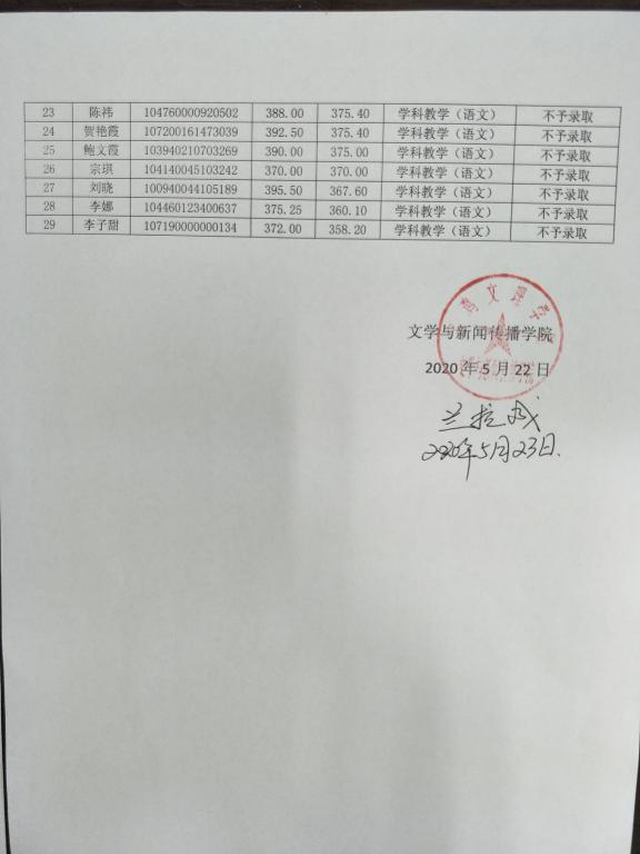 2020年英国365集团官网学科教学(语文)专业硕士研究生第一批调剂拟录取公告