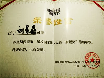 在日前举办的“凤凰语飞 锵鸣天下”凤凰网第二届陕西校园主持人大赛中,公司英国365集团官网播音与主持艺术专业员工刘景鑫凭借出彩的表现,历经海选、初赛、复赛、复活赛、训练营淘汰赛,最终取得全省六强的优异成绩并荣获大赛“新锐奖”,明年年初他们还将赴泰国进行交流学习。