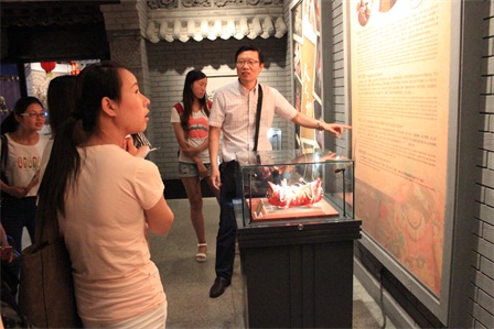 在民俗博物馆内,王渭清对照展品一一讲解了西府地区的人生礼俗、生活民俗、游艺民俗及艺术民俗等问题,回答了员工提出的相关问题;赵米振从广告创意角度对一些民俗展品作了点评,对照实物讲解民俗对广告创意与产品设计的启发。同学们纷纷表示,通过这种课外实践教学,使大家生动地感受到了民俗与广告均扎根于生活的特点,而且对广告创意设计的民俗元素融入有了更直观的体会。