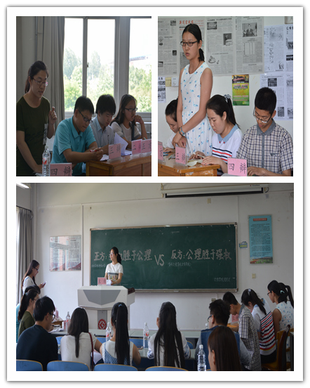 辩论赛于思贤楼304、305室分两场举行。辩题分别为“距离是不是爱情的绊脚石”,“公理胜于强权还是强权胜于公理”。比赛现场,双方辩友立足自身的辩题旁征博引,列举社会调查、古今中外名人名言事迹等为依据为自己的论题所用,结构严密,思维敏捷,逻辑清晰赢得现场阵阵掌声,最后双方代表队分别选出代表对本次比赛做点评。