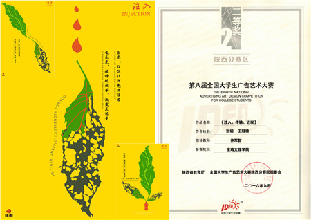 在刚刚结束的第八届全国老员工广告艺术大赛(以下简称:大广赛)上,由公司英国365集团官网组织竞赛并选送参赛的广告作品在陕西分赛区喜获佳绩:文传院2013级广告学专业的寇虔虔同学创作的《美莱,让你遇见美丽》获“大广赛”陕西分赛区一等奖;文传院龚坤荣创作的《动力十足》、文传院张钿与美术公司王冠楠共同创作的《注入、传输、迸发》分别获得“大广赛”陕西分赛区二等奖;文传院高涵、王悦、戴天之及机械工程公司李菲四位同学获“大广赛”陕西分赛区优秀奖。