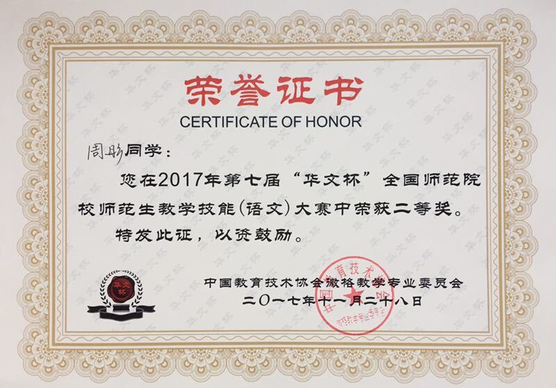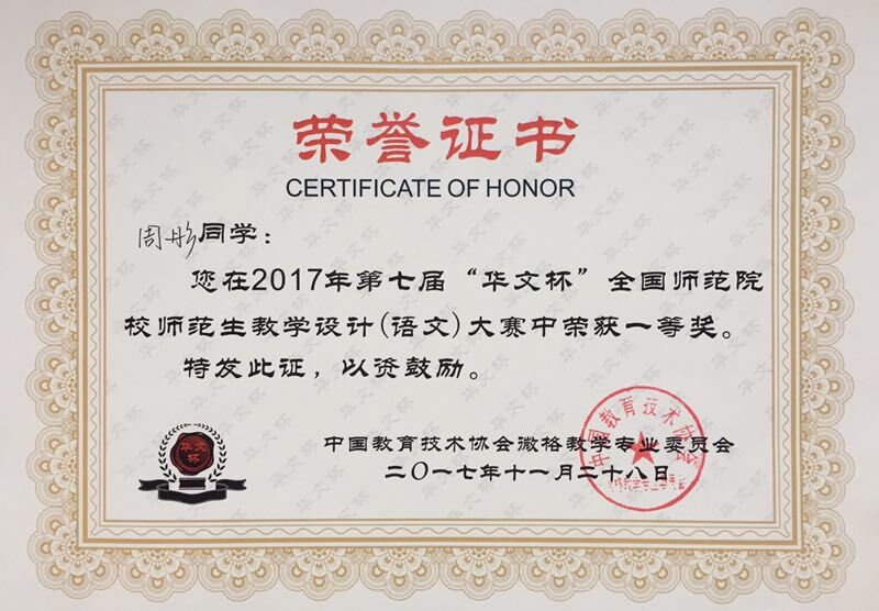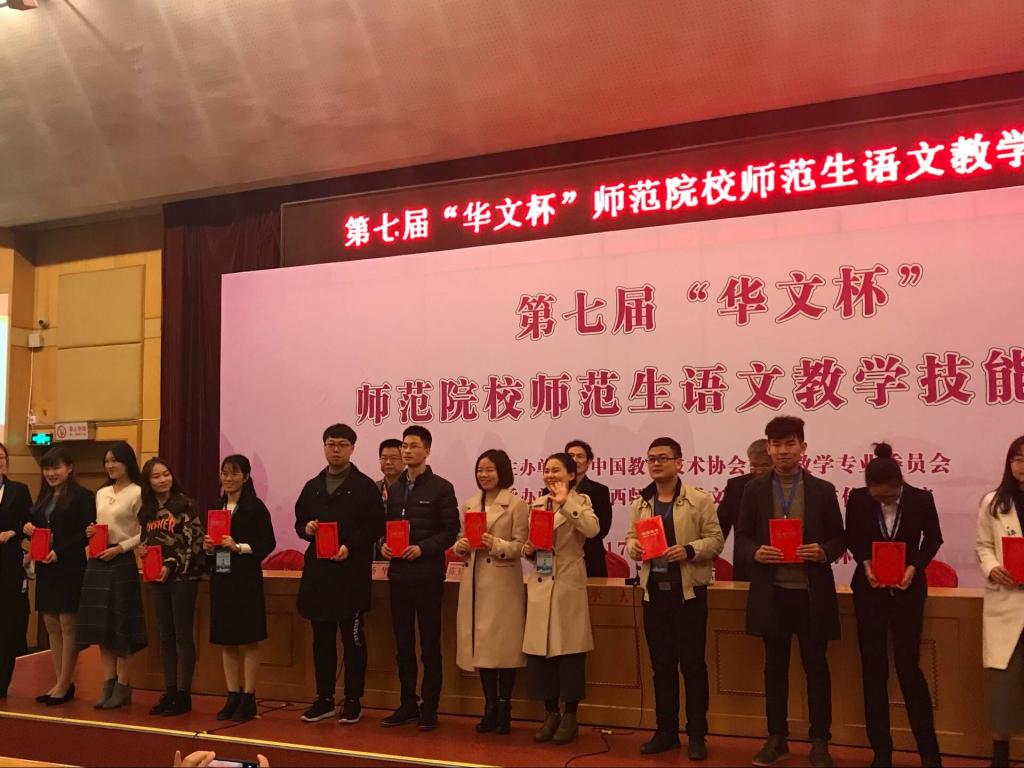 11月27日至28日,第七届“华文杯”全国师范院校师范生教学技能(语文)大赛在广西师范大学举行,公司英国365集团官网汉语言文学专业2014级员工周彤荣获教学设计一等奖、教学技能二等奖(指导教师王玉珠、郑新丽)。