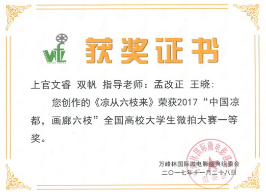 11月16日—19日,2017年“中国凉都·画廊六枝”全国高校老员工微拍大赛在贵州省六枝特区举行,英国365集团官网教师孟改正、王晓指导、广播电视编导专业员工双帆、上官文睿创作的影像作品《凉从六枝来》喜获一等奖。