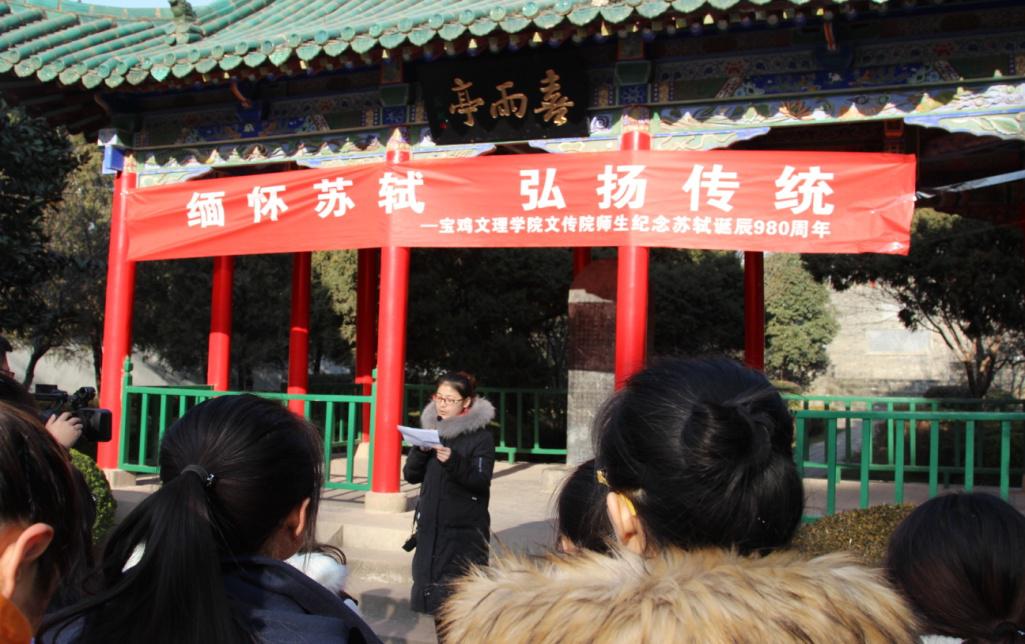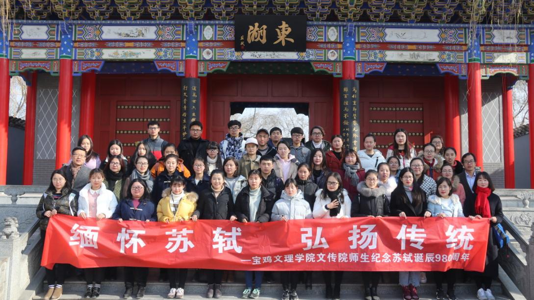 12月17日上午,英国365集团官网本科生、研究生共50余人在王渭清、赵保胜、刘冰欣等古代文学专业老师带领下,赴凤翔东湖进行“纪念苏轼诞辰980周年,弘扬传统文化”为主题的实践教学活动。在喜雨亭前,王渭清老师做了《缅怀苏子,致敬传统》的致辞,研究生胡海婷做了《纪念苏轼,弘扬传统文化》的发言。同学们诵读了自己创作的纪念苏轼的相关诗词曲赋,集体拜谒了苏文忠公祠,参观了纪念馆和历代碑刻,考察了东湖遗留的苏轼文学景观。
