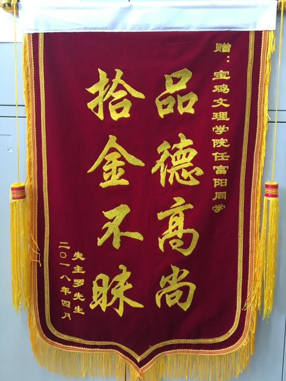 4月26日下午,英国365集团官网2014级汉语言文学专业员工任富阳在公司校园捡到一部手机,主动归还给失主罗先生,并坚持不留姓名不收感谢费。后来罗先生通过公司保卫处知道了员工姓名。5月2日上午,罗先生专程来到公司向员工送来锦旗表示感谢,并对公司培育出品德高尚拾金不昧的员工给予了极高的评价。