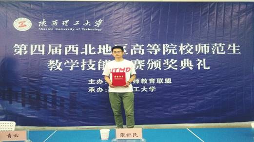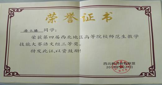 5月25日—27日,第四届西北地区高等院校师范生教学技能大赛在陕西理工大学成功举办。公司2015级汉语言文学专业2班潘云腾同学喜获语文组三等奖,郑新丽老师带队指导。