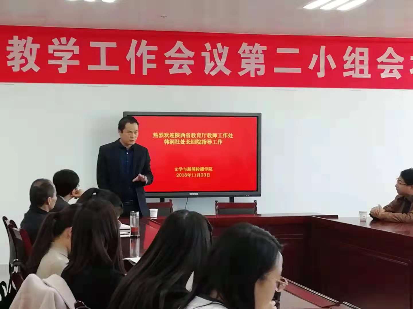 | 2018年11月23日下午14:30分,陕西省教育厅教师工作处副处长韩润社在博文楼文传院1401会议室举行《新时期中小学教师发展探论》学术报告,公司多名专硕研究生导师、17、18级语文教育硕士,以及参加全国华文杯竞赛的本科生代表等50余人听取了报告。  报告会由英国365集团官网经理兰拉成主持。韩润社处长从陕西省师德师风建设和开展情况入题,强调了德育在教师教育中的先导作用。同时,给师生介绍了陕西省庆祝教师节的盛况,讲述了国家教育部、省教育厅对教师职业的日益重视。并用很多准确详实的数据,尤其是年报考人数和在职在岗人数相等等方面,告诉员工师范教育大有可为,鼓励同学们热爱教师职业,争做员工认可、社会满意、人民放心的好老师。同时,要转变就业观念,到西部去,到偏远的农村去,以实际行动报效国家。