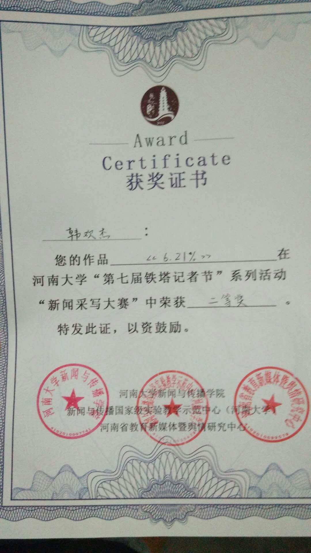 近日,公司2016级新闻专业员工韩欢杰在2018年河南大学第七届“铁塔记者节”系列活动中,荣获“新闻采写大赛”二等奖。