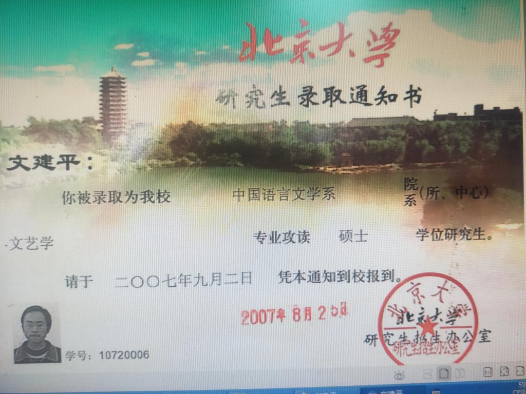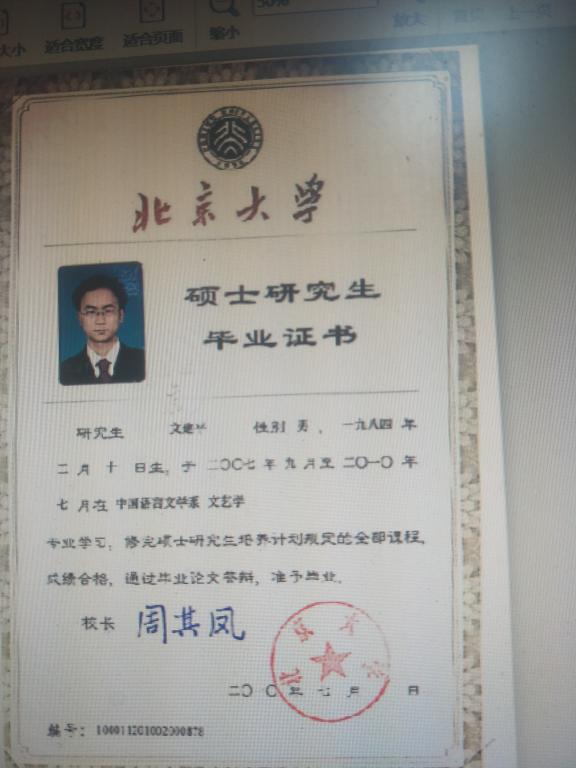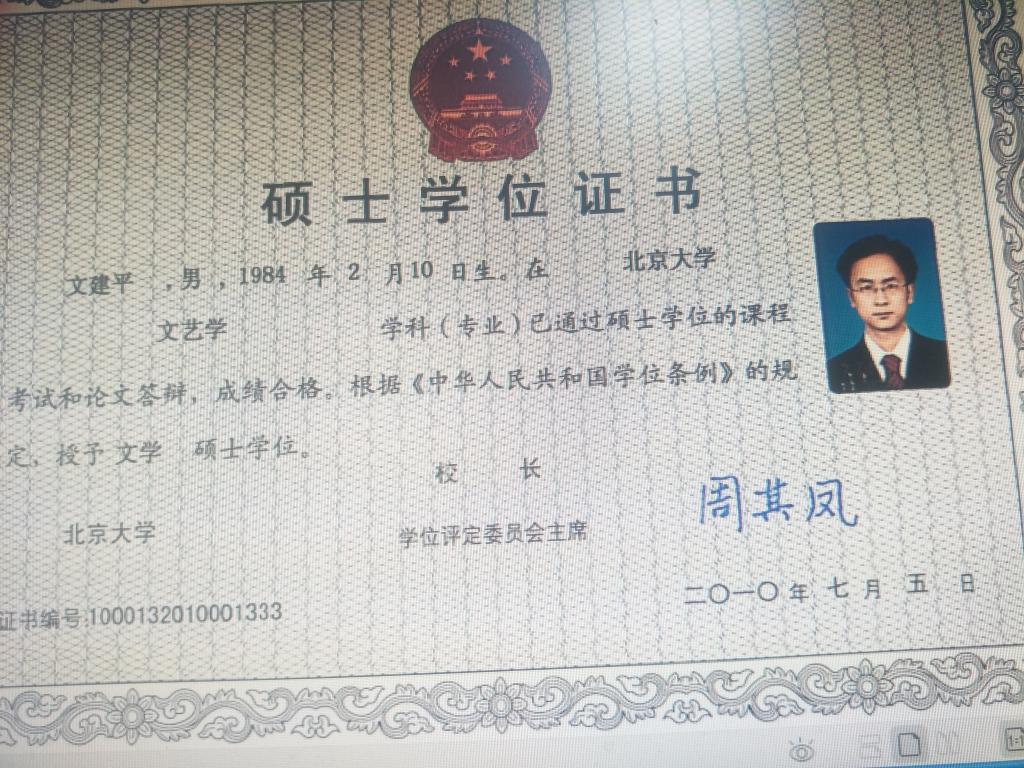 | 文建平员工当年北京大学颁授硕士学位证书 |