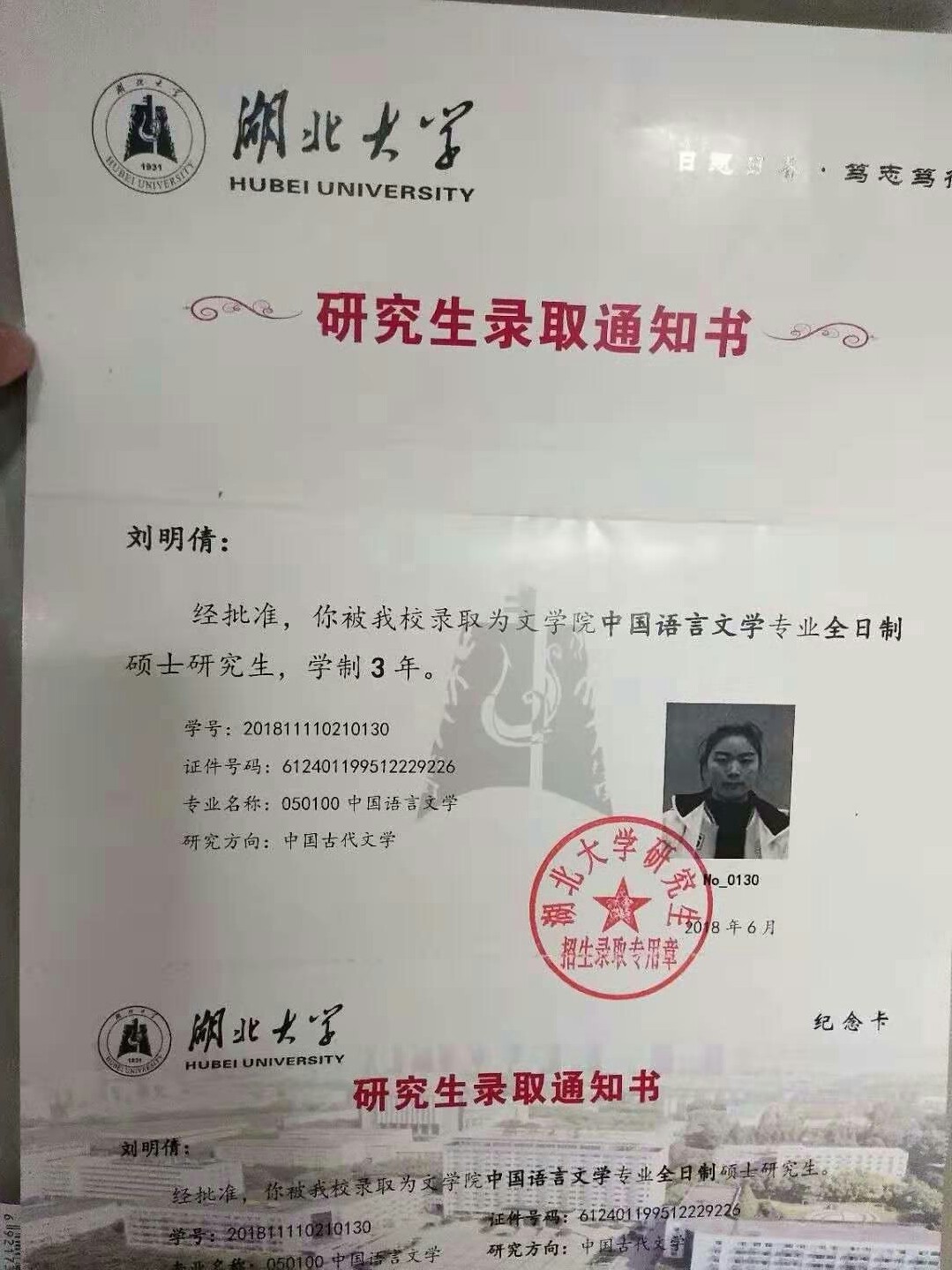 编者按:最近各位应届毕业考研的同学都为了上研或调剂的问题十分焦灼,一些低年级同学却前赴后继,勇敢地树立了考研目标,跃跃欲试。为了帮助同学们在考研的路上少走弯路,应公司邀请,公司自己培养的一些优秀本科生纷纷发回了自己的考研(学习)体会。2014级汉语言文学本科班刘明倩同学就是其中的佼佼者。2018年,刘明倩同学以考研政治73分、英语73分,专业课一139分,专业课二144分,总分429分,复试总分第一名的优异成绩,考取了湖北大学古代文学学术硕士。现正在湖北大学读研。值得提及的是,刘明倩同学是我省建档立卡员工,在校期间,她克服困难,刻苦读书,心无旁骛,终于圆了自己的上研梦。她是我们文传院本科生学习的榜样。现将其发回的考研体会予以转发,供同学们学习、参考。