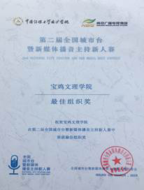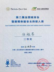 5月22日,第二届全国城市台暨新媒体播音主持新人赛总决赛在南京广电大厦一楼演播厅举行。公司英国365集团官网员工参加比赛并取得优异成绩,播音与主持艺术专业员工、声之韵朗诵艺术团团员徐雅芬荣获三等奖,公司荣获“最佳组织奖”。