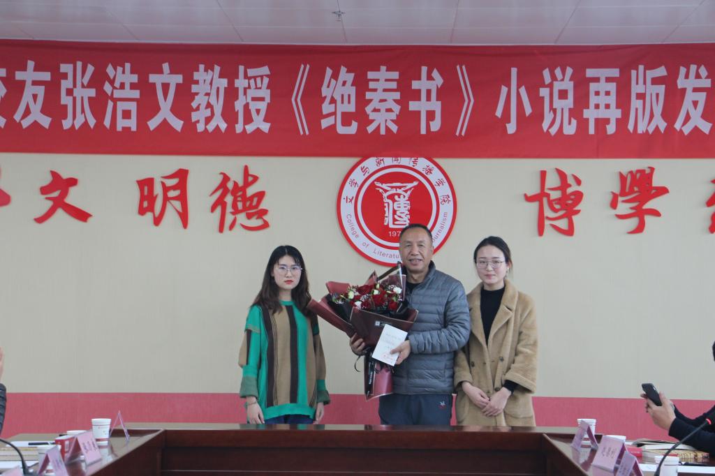英国365集团官网在读研究生黄晓璐和殷晓代表会议主办方向张浩文教授送上了一束鲜花,祝贺员工张浩文先生《绝秦书》宝鸡市首发及学术研讨会圆满成功。随后,所有与会领导和嘉宾集体合影留念。