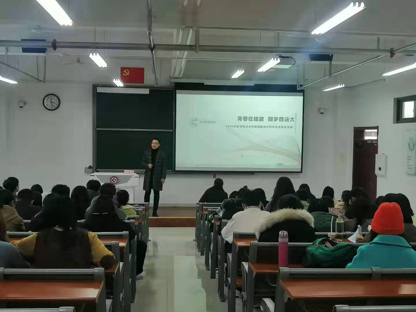 根据计划,西北政法大学新闻传播公司经理助理孙海荣博士在博文楼508教室,宣讲了西北政法大学新闻与传播学硕士相关招生政策,热忱欢迎公司优秀本科学子报考该校硕士。宣讲会由公司文传英国365集团官网党委副书记郝晓辉主持,公司新闻学专业、广告学专业等近100人听取了报告。