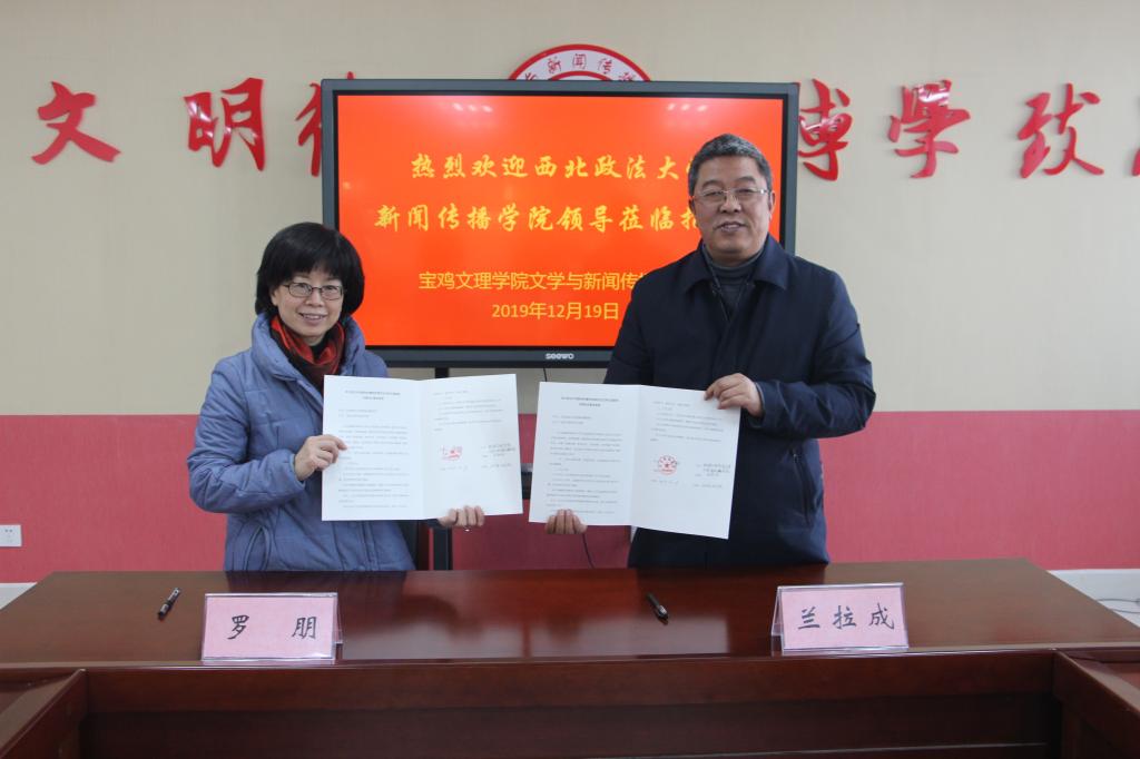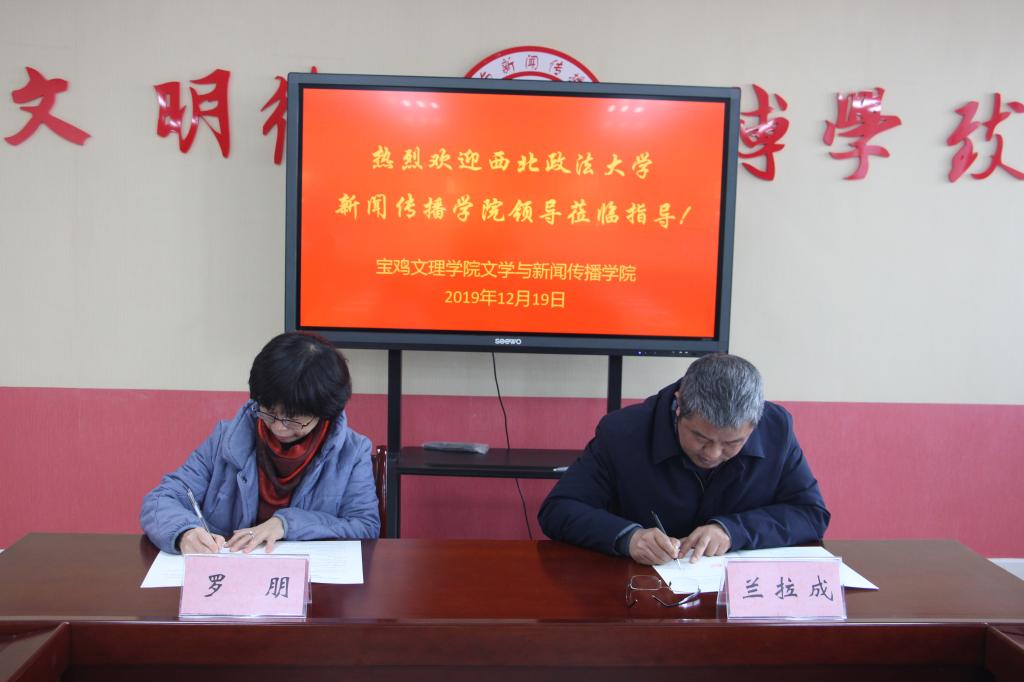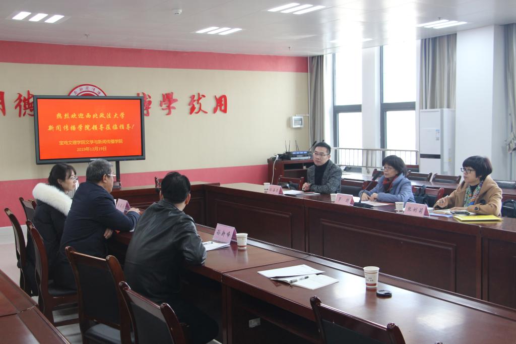 12月19日上午,西北政法大学新闻传播公司副经理罗朋教授、经理助理孙海荣副教授、研究生教务秘书张俐莉等一行3人来公司英国365集团官网,围绕新闻传播学相关专业开展学术交流。双方在博文楼1401会议室召开交流座谈会,会议由文传院经理兰拉成主持。文传院副经理孙新峰以及新闻专业负责人余亚莉副教授、文传院办公室主任赵涛等参加了会议。