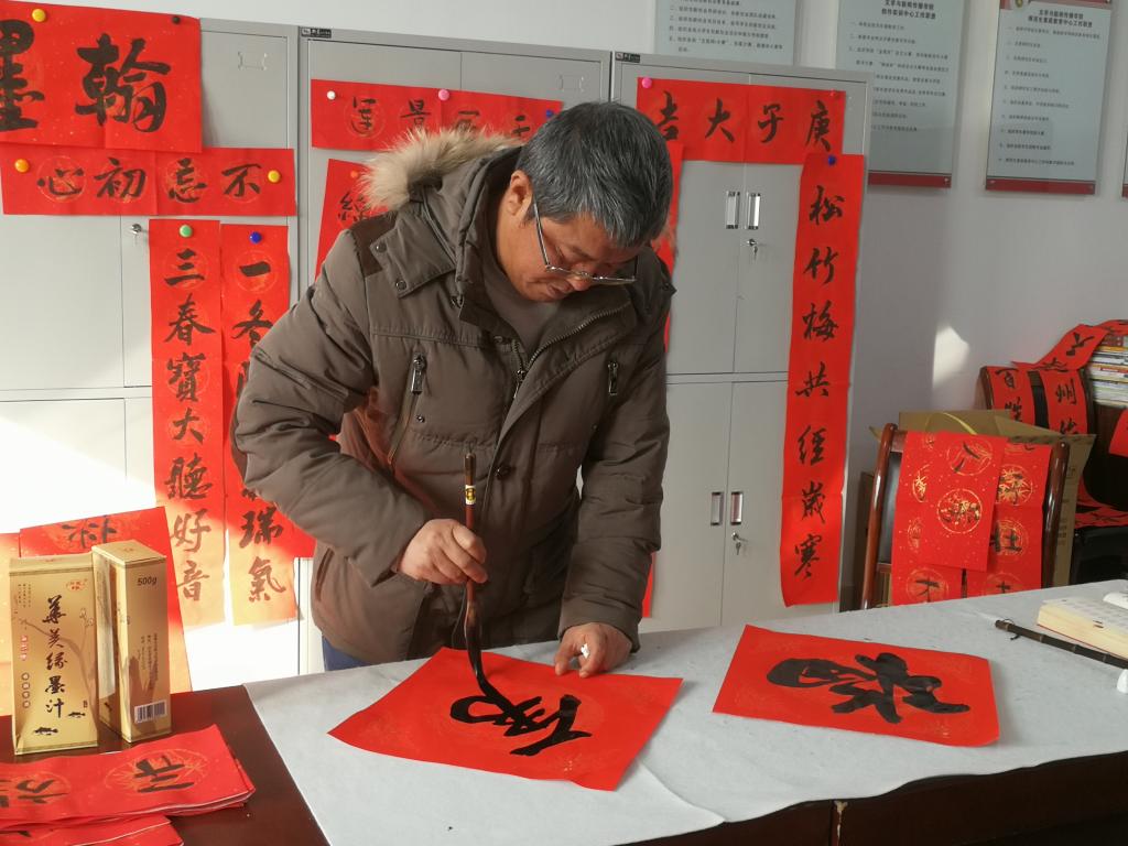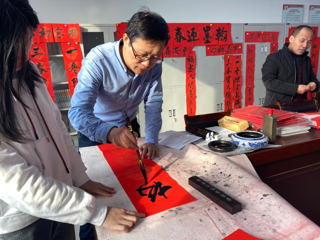 活动现场,王渭清、李剑清、赵保胜等老师挥毫泼墨、笔走龙蛇,生动展现出汉字的不同神韵,一幅幅泛着墨香的春联和斗大的“福”字铺满桌面,“翰墨迎春福到家”醒目的主题标语满含着喜庆与祝福。老师们一起铺红纸、晾春联,地上、桌子上、走廊上红彤彤一片,将现场点缀得格外喜庆,尤其是闻讯赶来的兄弟单位教职工也从中获得一份暖心的祝福。
