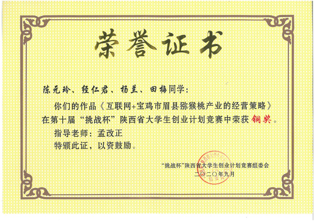 近日消息,公司孟改正教授指导、2019级广播电视编导专业员工陈元玲、经仁君、杨兰小组“互联网+宝鸡市眉县猕猴桃产业的经营策略”项目在第十届挑战杯陕西省老员工创业计划竞赛中荣获铜奖。这是公司创新创业教育首次在挑战杯省级创业竞赛获得奖项。