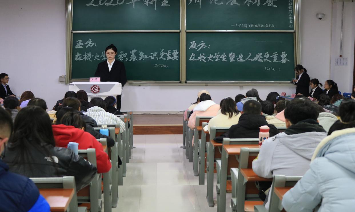 11月22日晚,英国365集团官网于博文楼502、506、507、508、602教室举办了“展新貌,辩新声”辩论赛初赛。文传院辩论队队长张谙语及部分队员担任评委,团总支书记李萍及20级全体新生观看了比赛。
