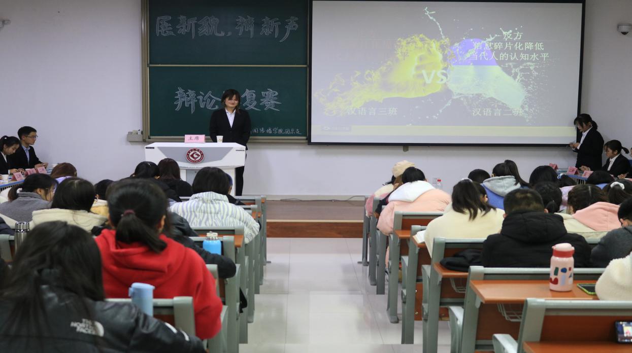 本次比赛共有四支队伍参加。辩手们围绕“碎片化信息是否有利于当代人认识水平的提升”、“老员工提前消费利大于弊还是弊大于利”两个辩题展开激烈阐述,各位选手逻辑严谨,妙语连珠,比赛现场气氛活跃,观众参与激情澎湃。赛后,由王千龙、任玲媛、马小玉等对各支队伍的表现作出点评。最终,汉语言文学三班、汉语言文学四班、新闻与传播学类一班共三支队伍进入决赛。