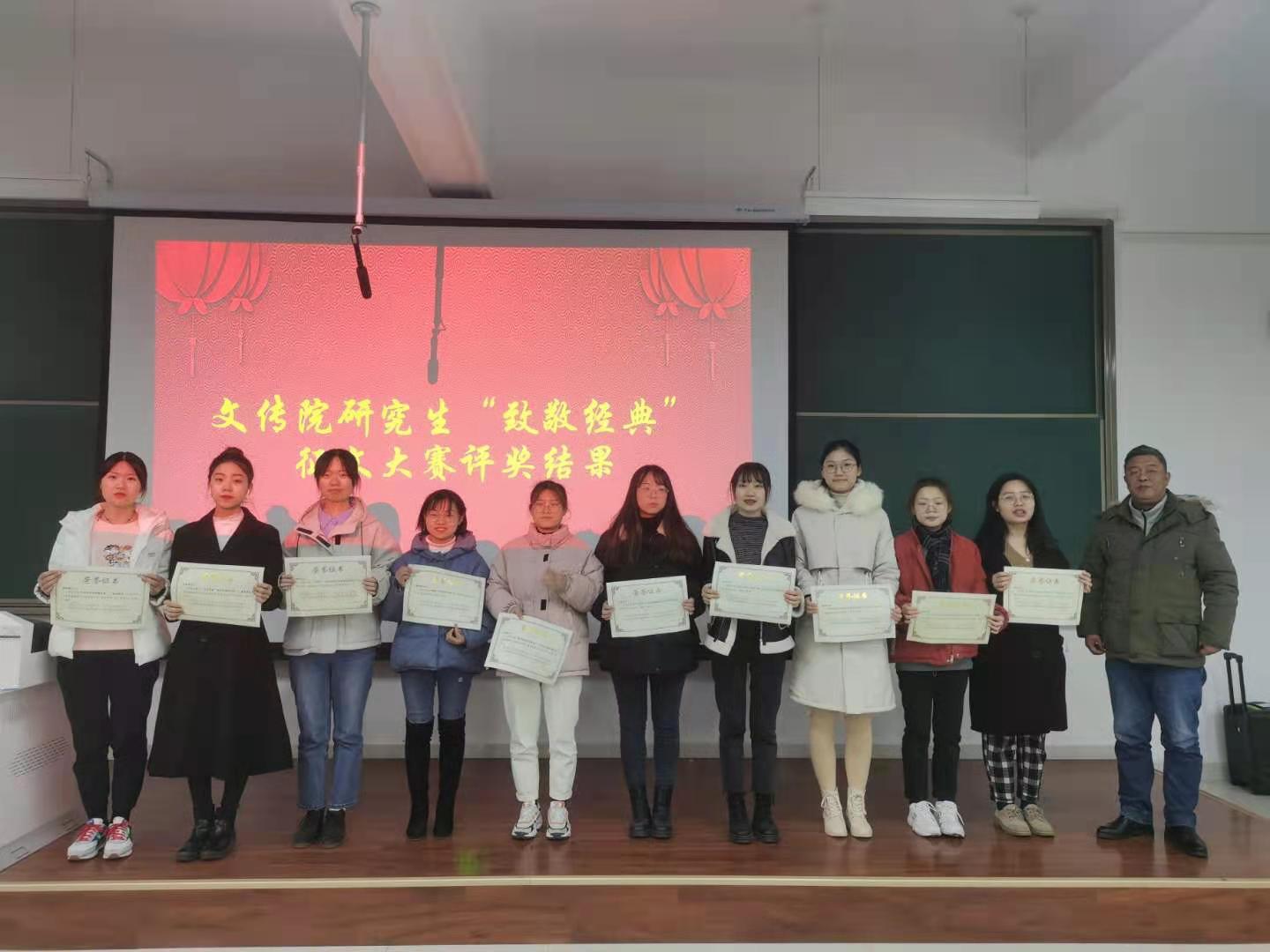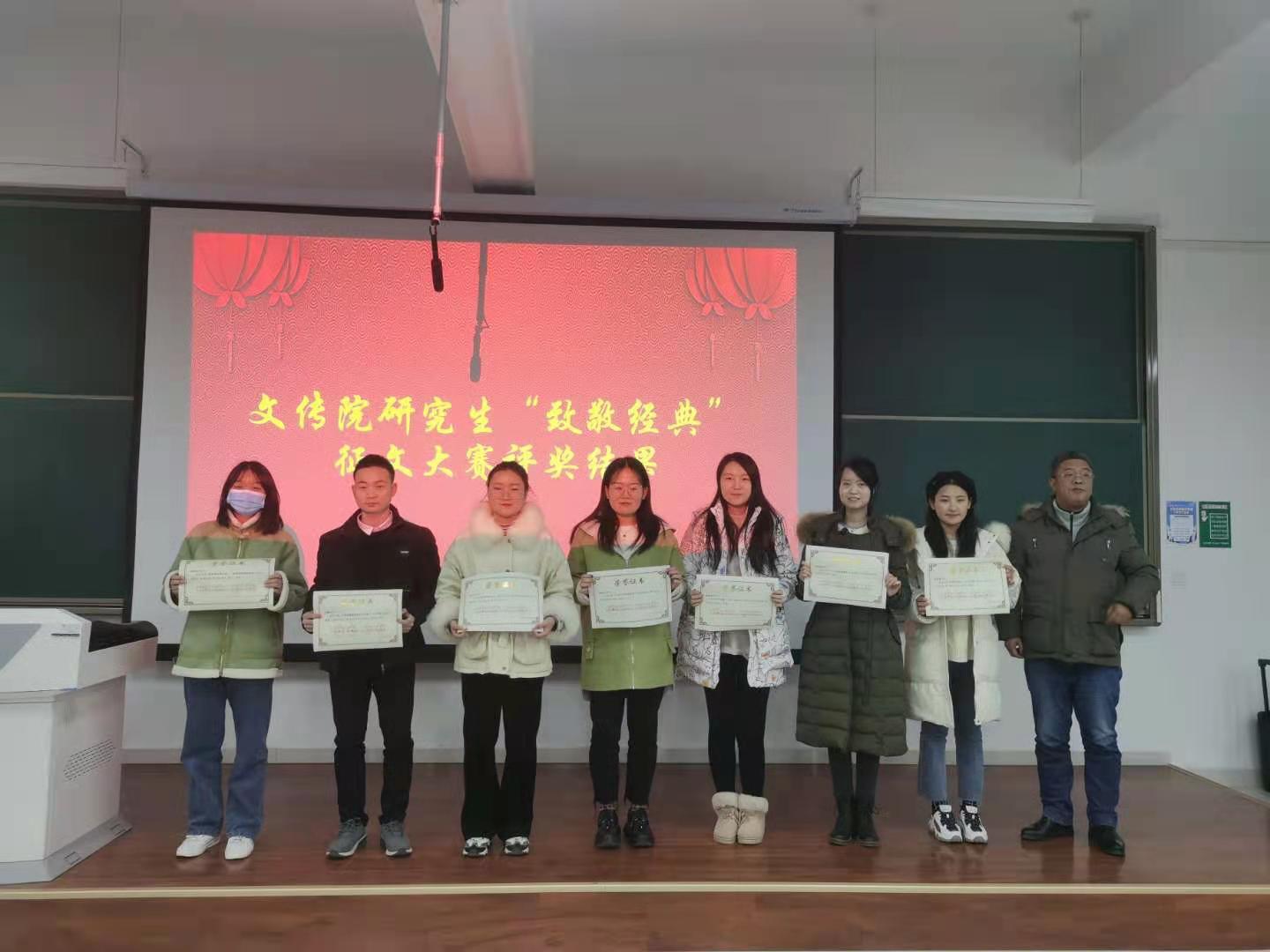 会议第二项:由宝鸡市文艺评论家协会兼职秘书长李剑清教授宣读文传院首届研究生“重读经典”征文大赛获奖名单。兰拉成经理为征文一等奖获奖者宋洁、罗璇 、连悦廷、周淑乐、朱慧颖等二十名获奖者颁奖。郝晓辉副书记为征文二等奖获奖者冯科、徐艳枝、张若男、曲静研、任若嘉等三十四名获奖者颁奖。李剑清教授为征文三等奖获奖者冯婉晴、曹海燕、牛犇等十九名获奖者颁奖。