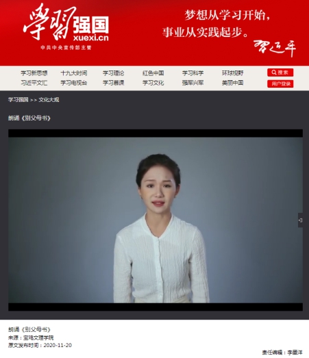 2020年12月26日,陕西省第五届朗诵大赛总决赛在西安举行,公司由宝鸡市朗诵家协会和播音主持艺术教研室联合推送的三组作品悉数获奖。播音与主持艺术专业2018级2班常思源、罗毅菲获得青年组二等奖,2018级1班杨钧然、翁灵获得青年组三等奖,2018级2班梁一萌、赵华康获得青年组三等奖。本次大赛旨在坚定文化自信,传承和弘扬中华优秀传统文化,为社会各界尤其是为广大青少年搭建一个学习传统文化、传承中华美德、培养爱国主义精神的艺术平台。