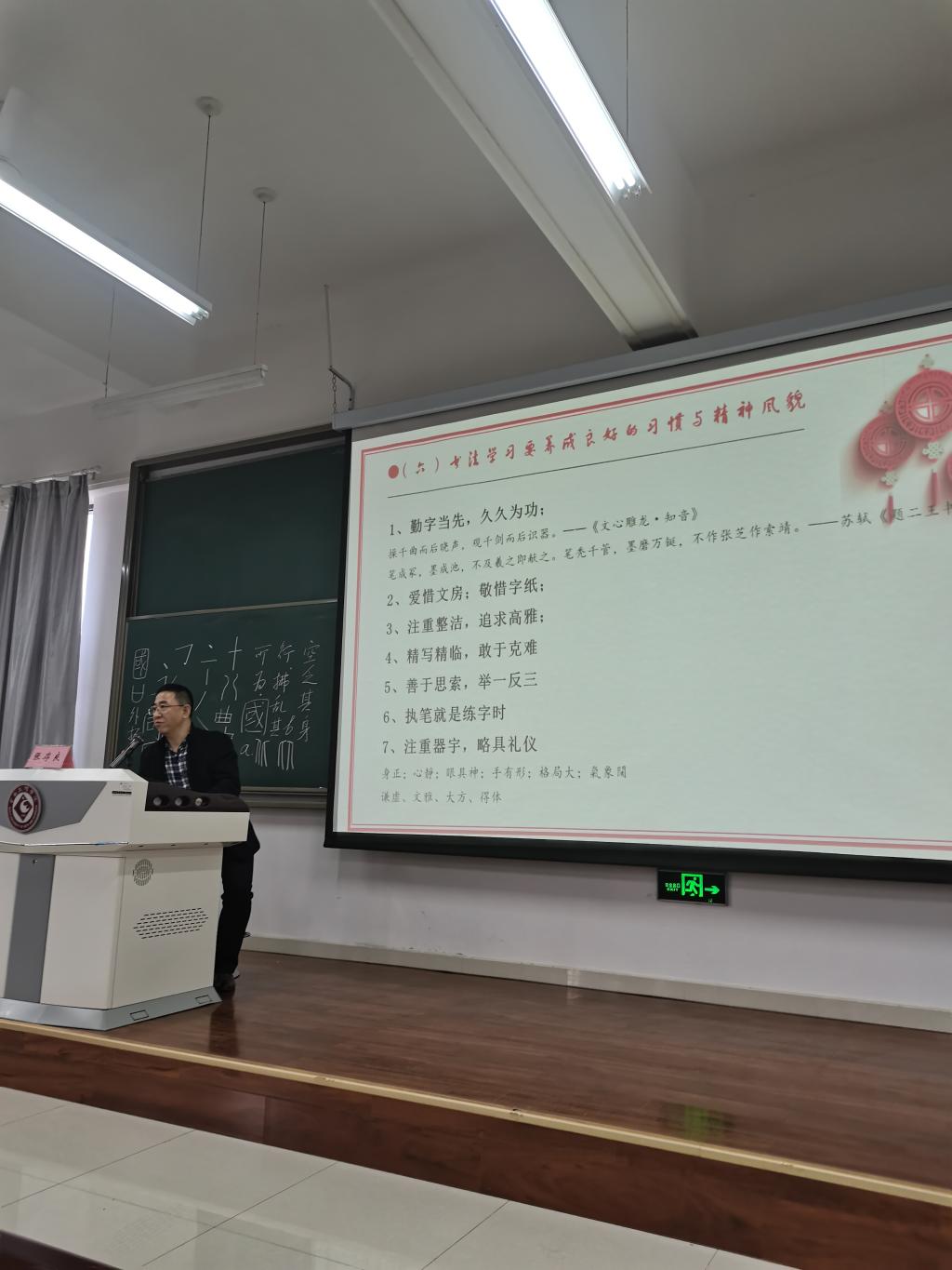 下午2时30分,于博文楼副楼205教室,第二场学术报告进行。由西华师范大学文公司副研究员、硕导张存良博士为公司20级本硕师生带来主题为“浅谈书法学习及其修养”的报告。报告由孙新峰教授主持。张老师以书法启蒙为主,带领大家追古溯源,从文字的演变开始谈起,探寻书法的历史衍生过程,在历史中去寻找书法的真谛。讲座中,张教授用精美的ppt,从选贴、临帖、具体的笔法技巧等多个方面,向同学们展示了历史名家们翩若惊鸿宛若蛟龙的文字,也在黑板上亲身示范书写,同时还向大家展示了临帖描红等练习书法的方式与技巧。结尾张教授还向同学们展示了近些年的十大“丑书”,以此警醒同学们学习书法要择良师而从。同时张教授认为作为一名文科生尤其是语言文学的员工,练好书法是必不可少的。会后,副经理孙新峰对讲座进行点评,首先他认可张教授提出的观点,同时也向在座即将走上教师岗位的同学们提出继续练好钢笔字、粉笔字的基本要求,对同学们传承中华传统文化寄以厚望。
