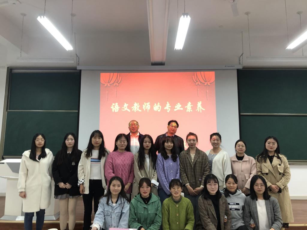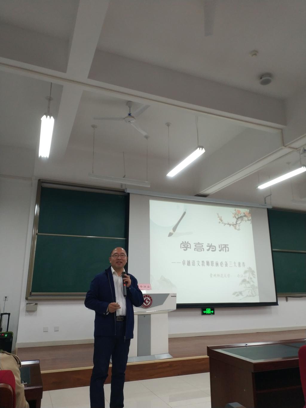 晚上7点30分第三场讲座继续进行。依旧在博文楼副楼205教室,来自贵州师范大学文公司副经理冷江山教授给师生带来主题为“语文教师的专业素养”的讲座。讲座由孙新峰副经理主持。公司20级专硕研究生以及2019级、2020级本科生同学们热情不减,认真聆听报告。冷教授以自己参加国家教师技能竞赛、贵州省技能竞赛等丰富的大赛经验现身说法,从三个层面向同学们展示如何上好一堂语文课。冷教授首先交给同学们从理论入手,将教育学、心理学等理论融入课堂之中;接着冷教授带给大家BOPPPS有效教学模式。一堂课如何导入、如何完成学习目标、如何参与到课堂之中再到如何结束都给同学们们带来了新的观点。之后冷教授务实的交给我们,理论是从实践中来也终究要回归到实践中去,积极鼓励大家通过理论的学习去研磨一场好课并付诸实践。结尾冷教授从细节入手,不论是教资教态、普通话、还是PPT或板书,都一一指导,使同学们打好成为一名合格教师的地基。整场讲座,冷教授用自己娴熟的教学风格积极和同学们互动,用幽默的方式吸引大家跟随他的思路,展示了一个优秀教师应有的从容与大气。会后孙教授对这场会议进行点评,他十分认可冷教授对大家的启发,他说:“这不仅是一场高水平的讲座更是一堂优质课”。同时他还认为“教学有法,教无定法,贵在得法”,鼓励同学们从不同途径切入教学方法,以至于融汇贯通,博取众家之所长成一家之课堂。会议结束时同学们依旧意犹未尽,围着冷教授探讨教学之法,争相和冷教授合影留念。