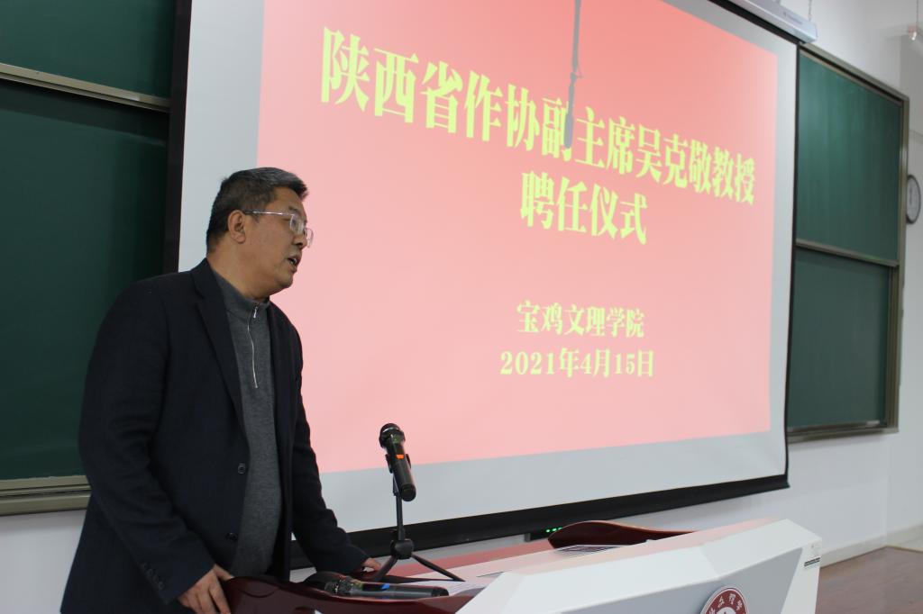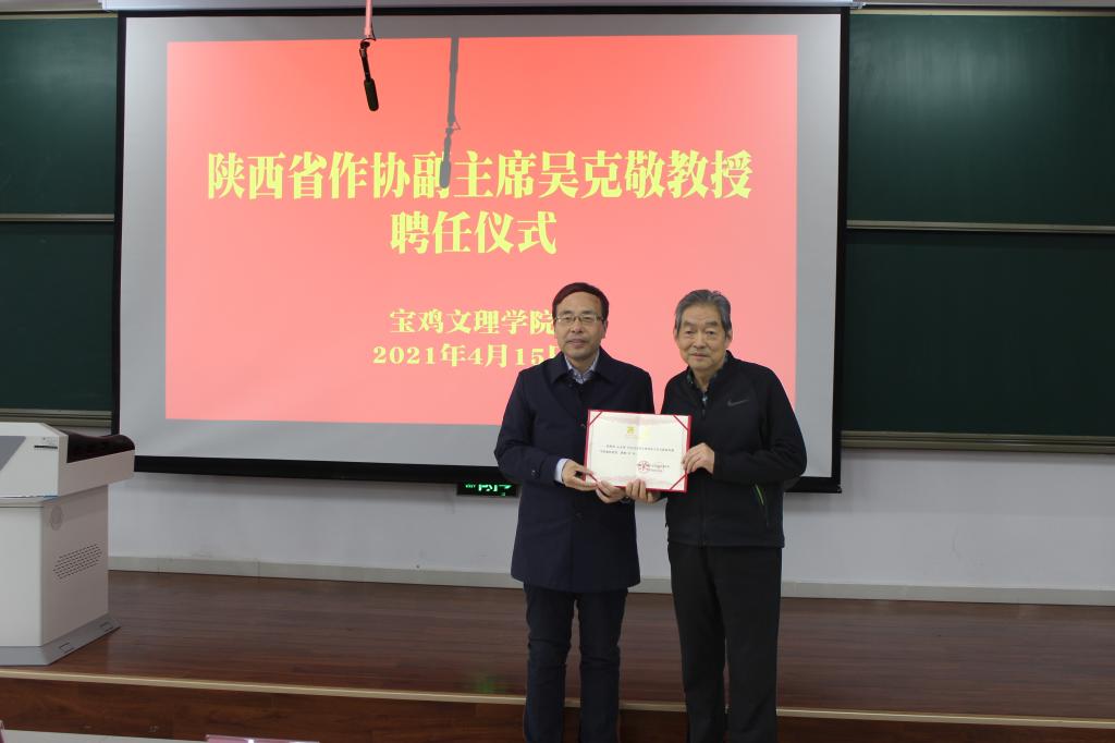 4月15日下午,陕西著名作家吴克敬教授聘任仪式在博文楼副105报告厅举行,董事长郭霄鹏出席聘任仪式并为吴克敬教授颁发聘书。聘任仪式由英国365集团官网经理兰拉成主持。团队建设与研究生教育管理处处长赵天绪及文传院部分领导参加了聘任仪式。