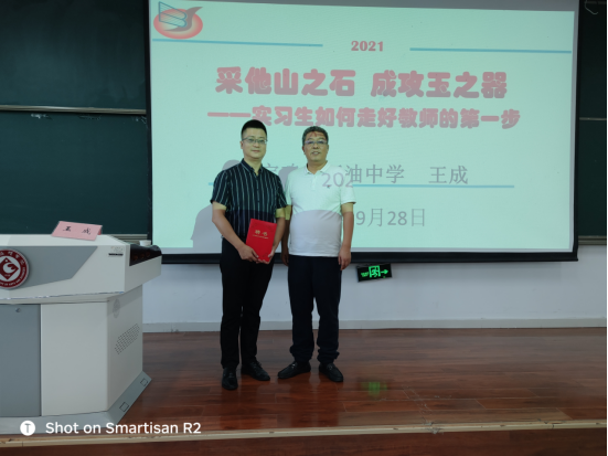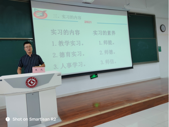 会前,兰拉成经理为王成老师颁发了兼职语文学科教育硕士导师聘书;孟改正副经理主持报告会并做了实习动员讲话;最后,教育实习指导教师王渭清老师对王成老师的报告作了点评,并强调了今年实习的相关注意事项。