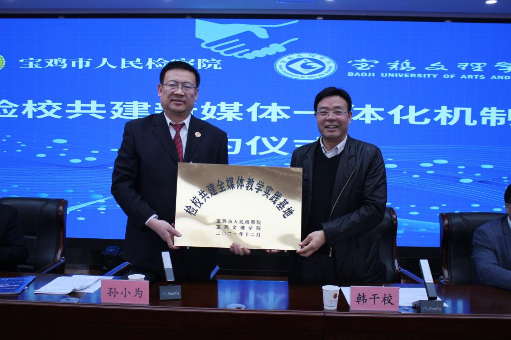韩干校向孙小为授予“检校共建全媒体教学实践基地”牌匾。文传院经理兰拉成与市检察院政治部主任李恩林共同签署检校共建新媒体一体化合作协议。