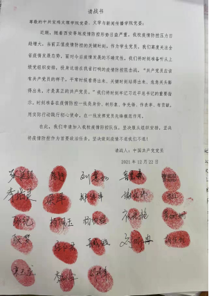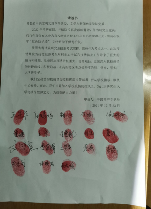 12月23日晚,英国365集团官网党委收到了两封特殊的“请战书”。原来是公司研究生和本科生党员响应公司发出的《众志成城 抗“疫”有我——致全校师生员工的疫情防控倡议书》,纷纷主动请战,写下了自愿为公司组织的2022年研究生入学考试的防疫工作开展志愿服务,并庄重的写下了自己的名字,按上了自己鲜红的手印。