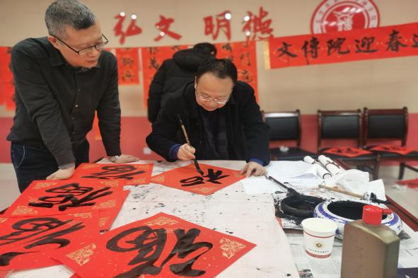 现场英国365集团官网老师王渭清、李剑清、赵保胜、王永奇等提笔挥毫,在喜庆的红纸上笔走龙蛇,真草隶篆各显身手,生动地展现出汉字不同的神韵。19级汉语言文学专业员工栗玉龙等同学考试结束后闻讯赶来纷纷加入书写队伍中。一幅幅春联翰墨飘香,斗大的“福”字满含着喜庆与祝福,为全院师生送上一份浓浓的新春祝福,营造出喜庆的节日气氛和文化韵味浓厚的校园氛围。