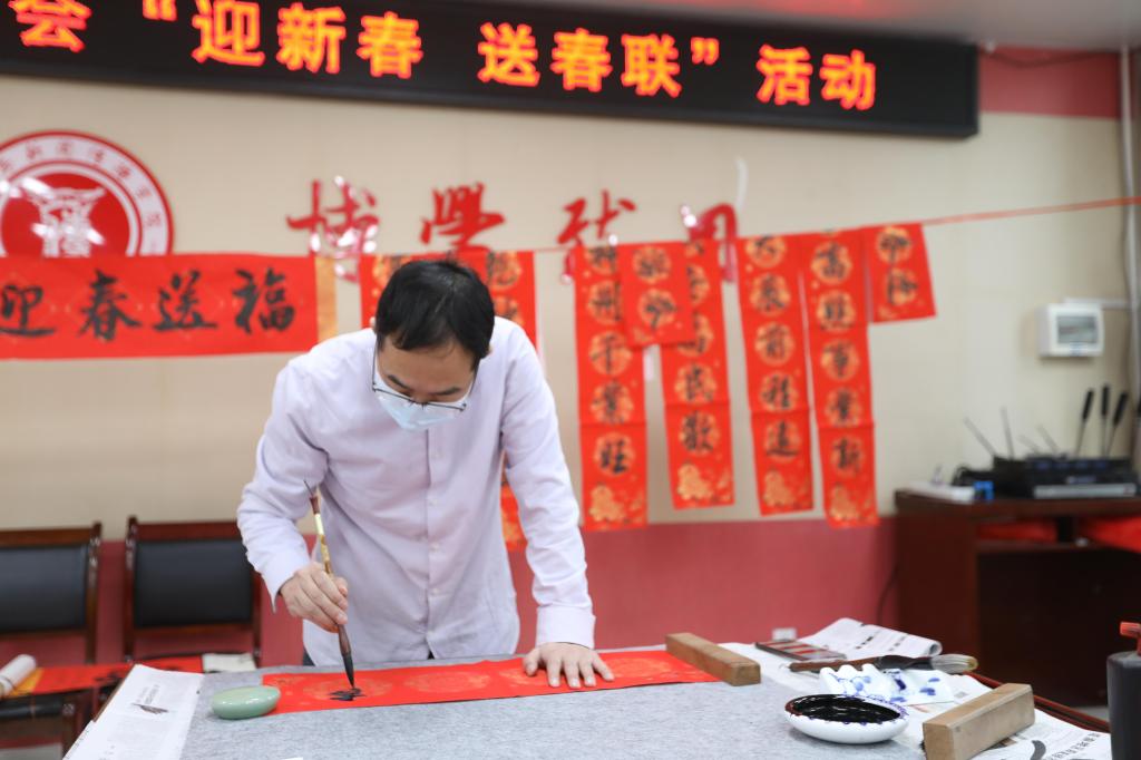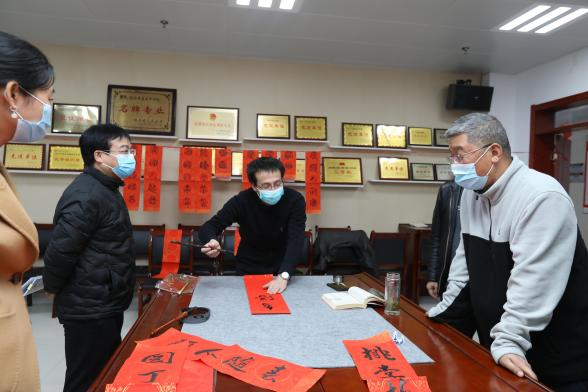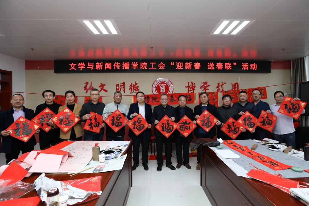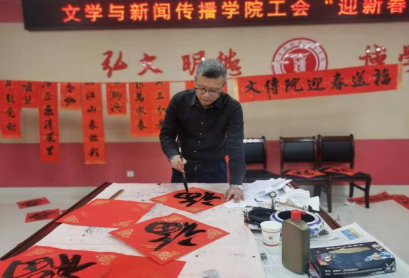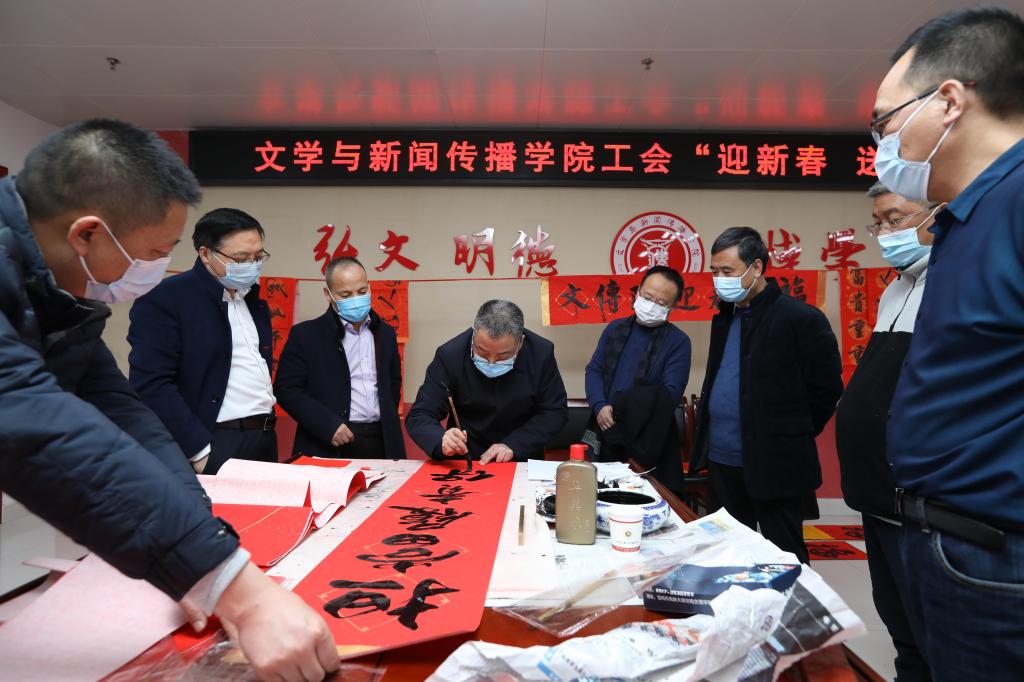 1月7日下午,英国365集团官网在博文楼1401会议室举行“迎新春 送春联”暖心活动,传承优秀传统文化。英国365集团官网党委副书记栾宏莅临并现场挥毫泼墨。校工会主席郭宏科等部门负责人以及文学与新闻传播英国365集团官网党政领导参加了本次活动。