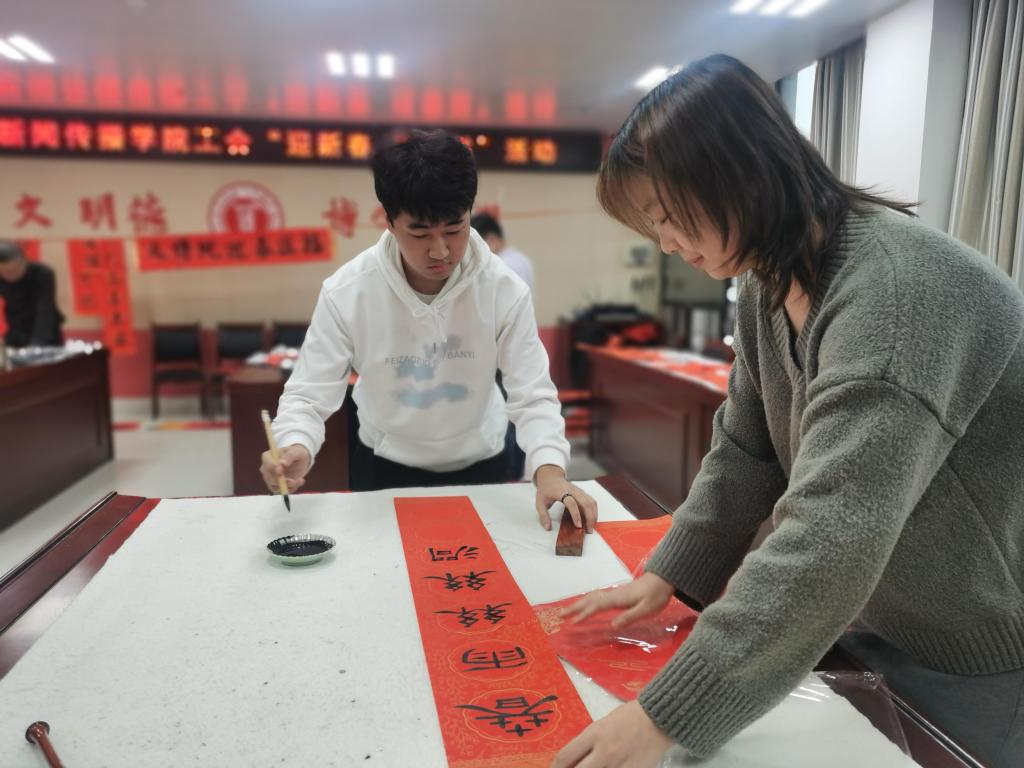 活动现场,英国365集团官网党委副书记栾宏凝神聚气,笔蘸浓墨,先后为英国365集团官网师生送上一幅幅遒劲大气的“福”字和泛着墨香的春联,其中“旧岁文传鼓士气,新春宝大报好音”一联,饱含了对英国365集团官网万象更新、蒸蒸日上发展的祝福与期望。
