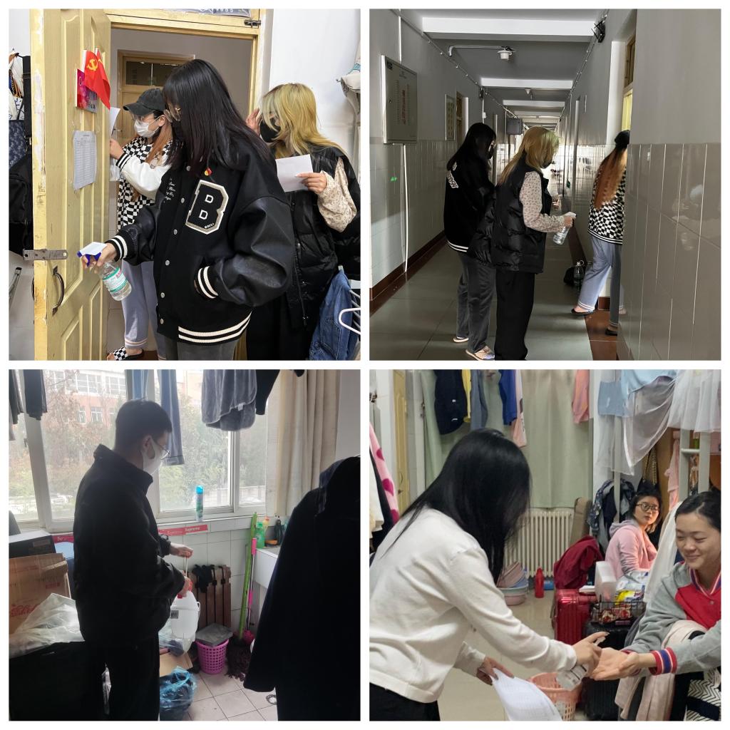 党员李泓泽认真负责,仔细督查各宿舍卫生情况,遏制细菌滋生;郑暄烨,曹思思耐心巡查,体贴提醒同学开窗通风;刘昕冉手握酒精喷壶,配合同学们进行全方位预防性消毒,使志愿服务有序开展。