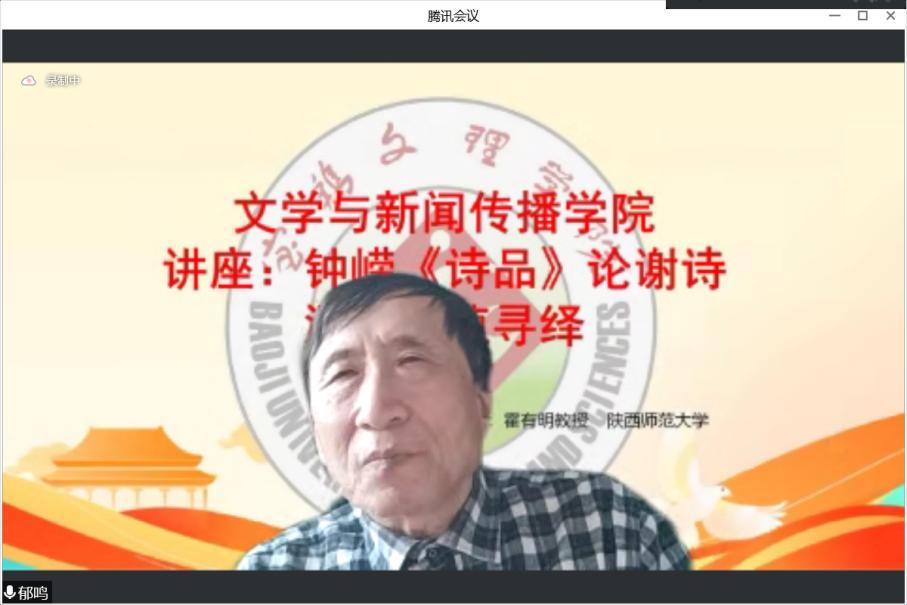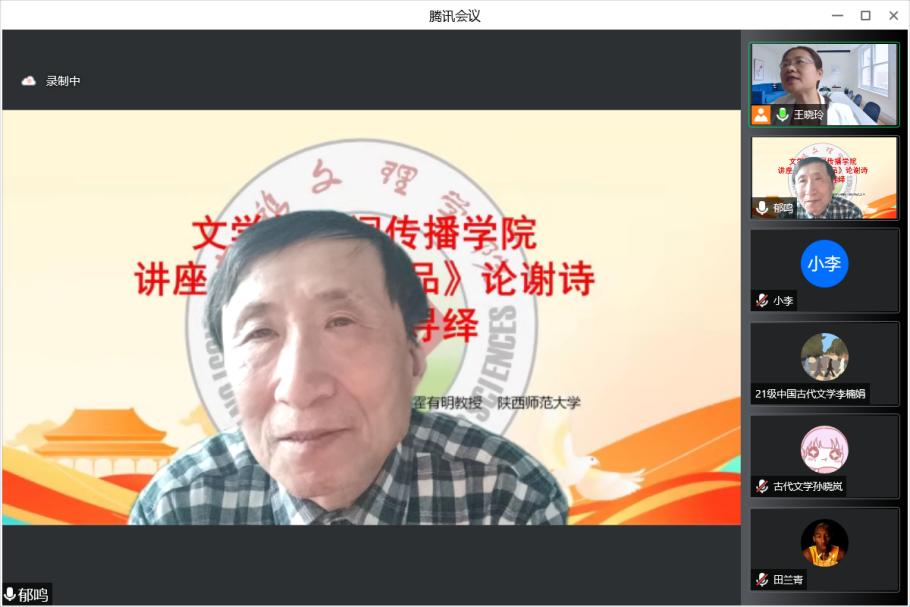 2022年5月28日下午14:30在腾讯会议室,公司举行了英国365集团官网博士生导师霍有明教授《钟嵘<诗品>论谢诗源出曹植寻绎》的专题学术报告。英国365集团官网王晓玲副教授担任此次讲座的主持。全体古代文学方向在读研究生于线上聆听了报告。