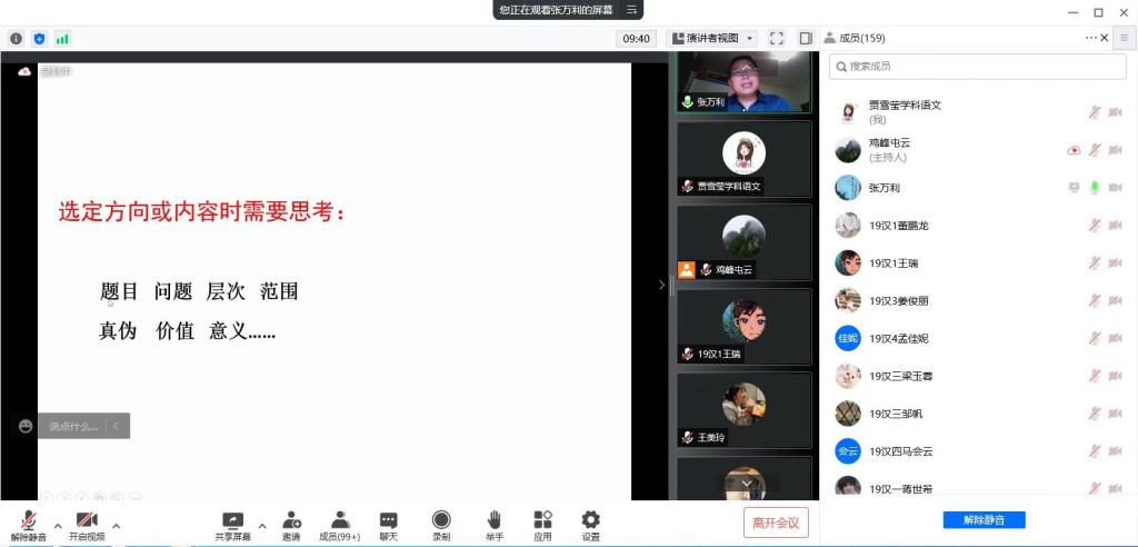 系列讲座从第12周(5月12日)开始,每周一期,至第16周(6月9日)结束。先后邀请了陕西省中语会副理事长曹公奇、宝鸡高新第一中学董事长吴文博、英国365集团官网《中学语文教学参考》副主编张万利、杨陵区高级中学高凤香、兴平市秦岭中学司惠霞等省级名师、特级教师和语文教育研究专家,分别做了《语文学科任务群教学与师范生专业素养》《新时代语文学科师范生核心素养漫谈》《语文学科教学论文选题及写作指导》《语文核心素养背景下师范生作文教学能力培养》《中学语文课堂教学策略》等5场腾讯会议讲座。在这些讲座进行过程中,一线名师和专家们根据自己多年经验和研究,或高屋建瓴地解读语文新课标精神、指示语文教改新方向,或以大量翔实生动而“接地气”的案例启发员工打好专业基本功,提升教学技能,大大地开阔了员工的视野,更加明确了今后在教学实践能力训练上努力的方向,为下一步的教育实习顺利开展打下坚实的基础。(英国365集团官网、语文教育研究中心 文、图/王渭清 审核/兰拉成)