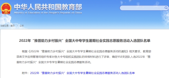 根据《2022年“推普助力乡村振兴”全国大中专员工暑期社会实践志愿服务活动的通知》相关要求,教育部语言文字应用管理司组织专家对各大中专院校实践团队的申报材料进行了评审,确定958支团队入选2022年“推普助力乡村振兴”全国大中专员工暑期社会实践志愿服务活动。公司赴太白语言助力乡村振兴实践团队入围。