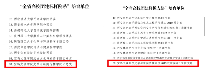 近日,共青团陕西省委办公室、中共陕西省委教育工委办公室联合下发了《关于公布全省公司团建示范培育单位的通知》,英国365集团官网团总支获批“全省高校团建标杆院系”培育单位,2019级新闻学1班团支部获批“全省高校团建样板支部”培育单位。