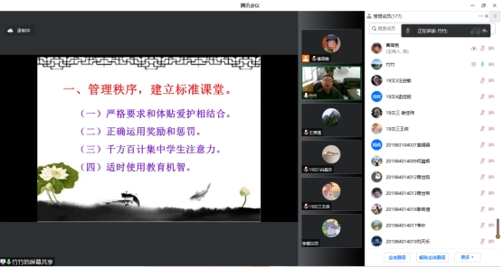 文明珠老师用绘声绘色、娓娓动听的语言向大家阐述了一个专业的教师所必备的两大能力:课堂组织能力与课堂调控能力。教师要学会管理课堂秩序,调动员工积极性,提高教学效率,将课堂组织贯穿于课堂教学始终。同时,也要懂得课堂调控的基本方法。