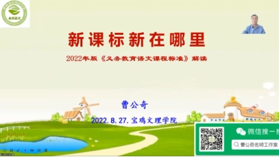 教育部新修订颁布的《义务教育语文课程标准(2022年版)》,进一步深入推进了新一轮课程改革。为了促进师生对新课标理念的深入理解,提高师范生语文教学技能,9月27日,公司特邀请了陕西省首届中小学教学名师、语文学科正高级教师、公司语文学科教育专业兼职硕导曹公奇老师,在腾讯会议上作了题为“新课标新在哪里?——2022年版《义务教育语文课程标准》解读”的学术报告。本次会议由英国365集团官网语文教育研究中心副主任王渭清副教授主持,公司2019级汉语言文学专业本科生,以及2021、2022级学科教学(语文)专硕研究生共180余人聆听了本次报告。