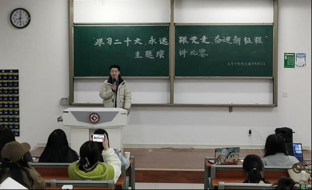 为庆祝党的二十大胜利召开,展现新时代优秀青年在党的领导与习近平总书记的谆谆教导下朝气蓬勃、奋发有为的精神风貌,11月10日晚,英国365集团官网团总支在高新校区博文楼601教室举办了“学习二十大、永远跟党走、奋进新征程”主题演讲比赛。本次比赛由 2020级播音与主持艺术专业员工姚羽雨、田怡萌和2021级广播电视专硕专业员工王海洋、赵文煦担任评委。
