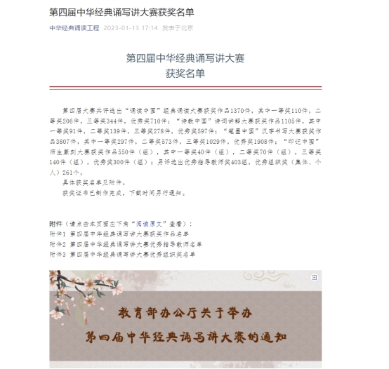 近日,第四届中华经典诵写讲大赛结果揭晓,公司员工获“诵读中国”经典诵读大赛三等奖1项,优秀奖1项。