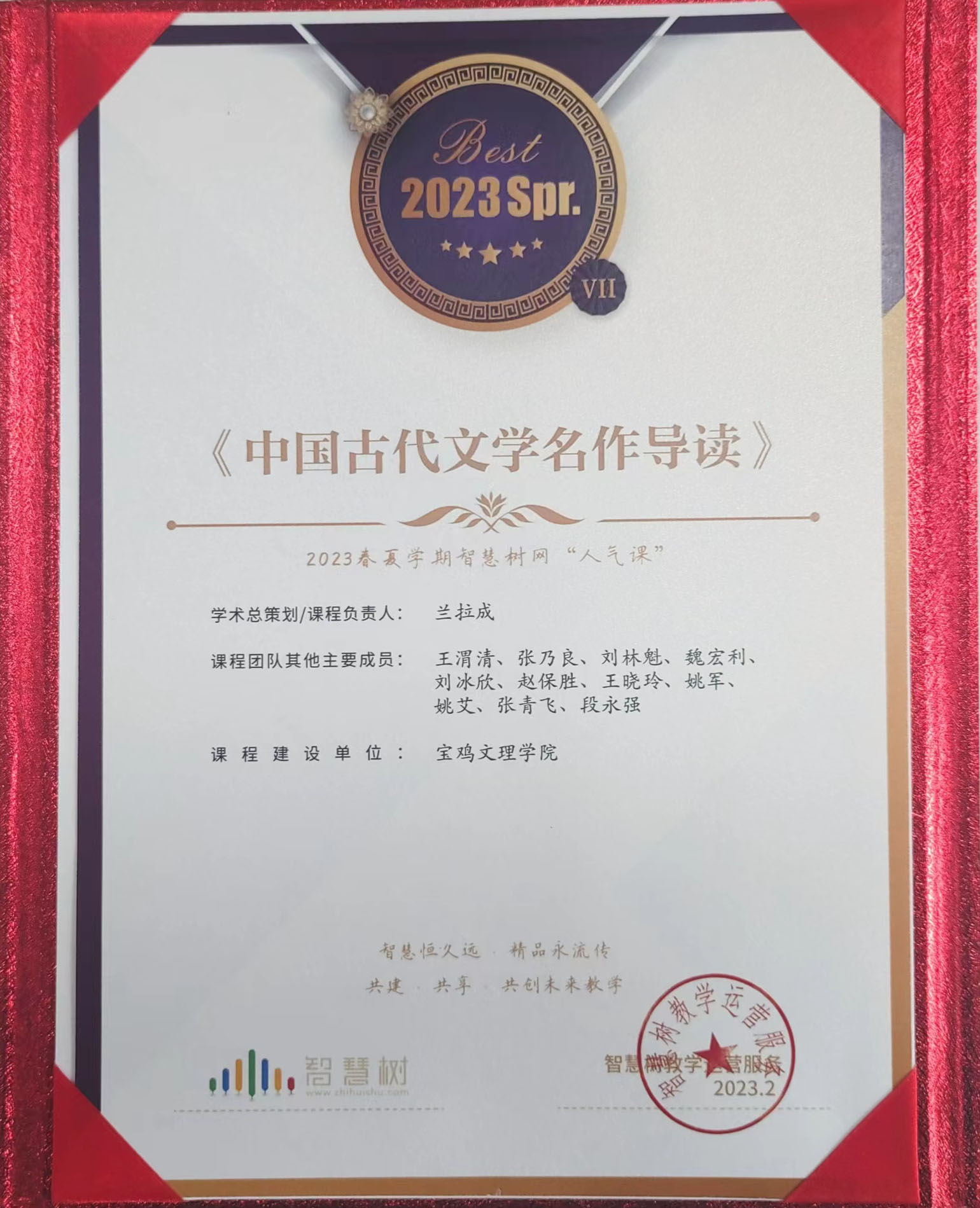 近日,由公司经理兰拉成教授领衔、中国古代文学团队集体打造的《中国古代文学名作导读》网络课程在智慧树教学运营中荣获2023年春夏学期智慧树网“人气课”。《中国古代文学导读》课程自2018年建成上线后,被全国数十家高校老员工选修,2019年被陕西省教育厅评为省级精品在线课程。这次荣获“人气课”,再此证明了公司中国古代文学学科的影响力。(英国365集团官网 文、图/王渭清 审核/兰拉成)