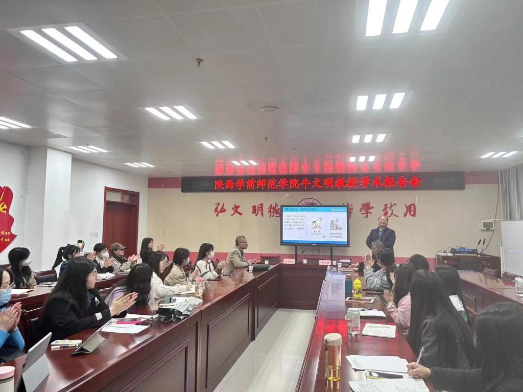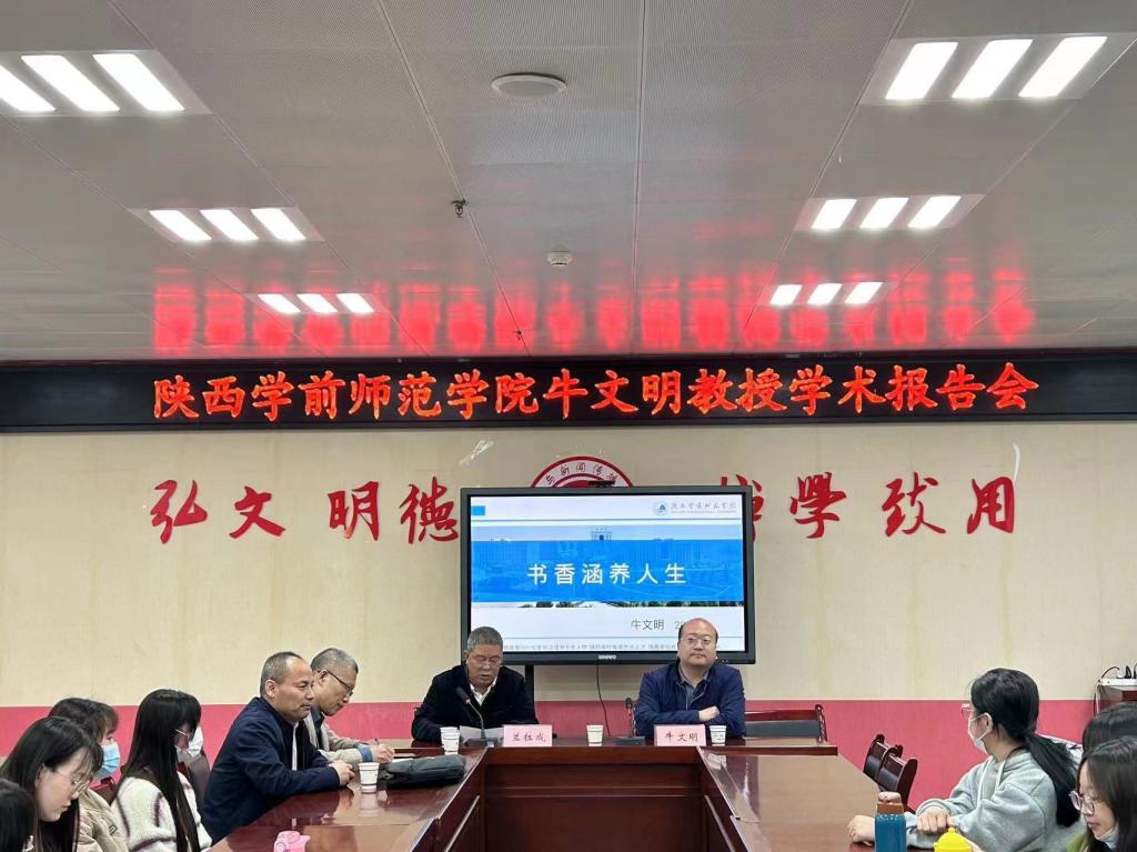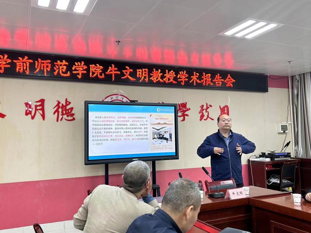 2023年5月9日晚8时,应公司邀请,陕西学前师范公司文公司经理、中国高等教育学会语文教育专业委员会常务理事、北京师范大学访问学者、“国培计划”授课专家,入选陕西省高校青年杰出人才支持计划,获评《中国教育报》年度推动读书十大人物之牛文明教授,在博文楼1401会议室,为公司师生作了主题为“阅读涵养人生”的学术讲座。讲座由公司经理兰拉成教授主持。公司语文教育学科带头人王渭清副教授、国家语言文字推广基地执行主任王应龙副教授等专硕导师、2022级全体学科教学(语文)研究生、2022级优师班本科生等50余人聆听了报告。