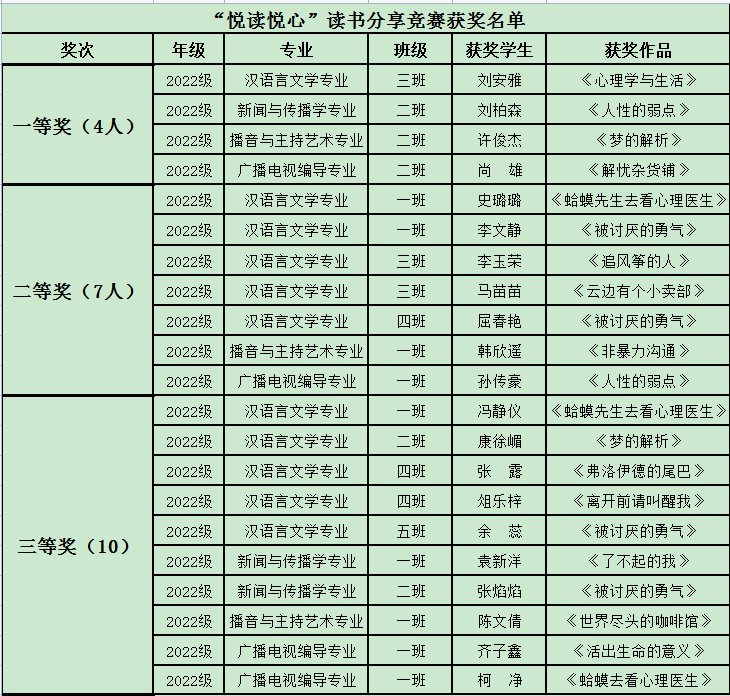 经评选,公司2022级汉语言三班刘安雅等4名同学荣获一等奖,2022级播音与主持艺术专业一班韩欣遥等7名同学荣获二等奖,2022级新闻与传播学专业一班袁新洋等10名同学荣获三等奖。