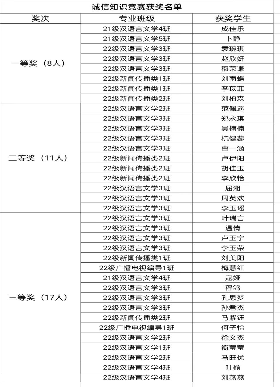 经评选,公司2021级汉语言文学4班成佳乐等8名同学荣获一等奖,2022级汉语言文学2班范佩遥等11名同学荣获二等奖,2022级汉语言文学3班叶瑞言等17名同学荣获三等奖。