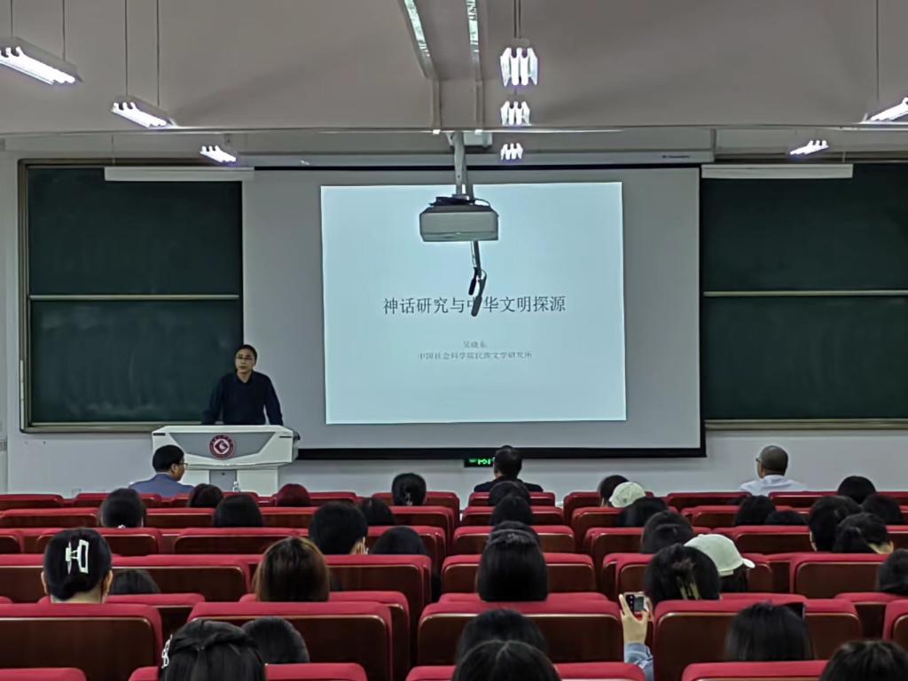 5月14日下午,中国社会科公司大学教授,博士生导师吴晓东教授应邀来关陇基地交流,在博文楼副105为文传院师生做《神话研究与中华文明探源》学术报告,报告会由文传院副经理孟改正教授主持,文传院150余名师生聆听了报告。