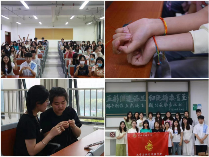 活动中,星火爱心社负责人陈思怡向同学们介绍了端午五彩绳的来历和发展过程等民俗文化。随后,大家用现场提供的道具编织五彩绳,一条条丝线穿插交缠,串联起活动现场所有人探寻古典艺术的热情,织就中华民族传统文化的独特魅力。活动结束后,大家将亲手编就的手工作品通过线上平台发布展示,并写下活动感悟。